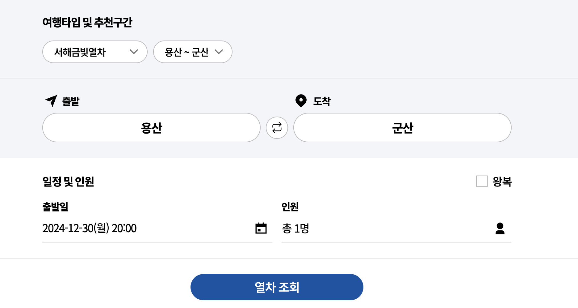 여행타입및 추천구간에 내가 원하는 타입과 구간을 선택하고 출,도착을 설정한후 일정과 인원을 선택후 열차조회를 누르면 됩니다.