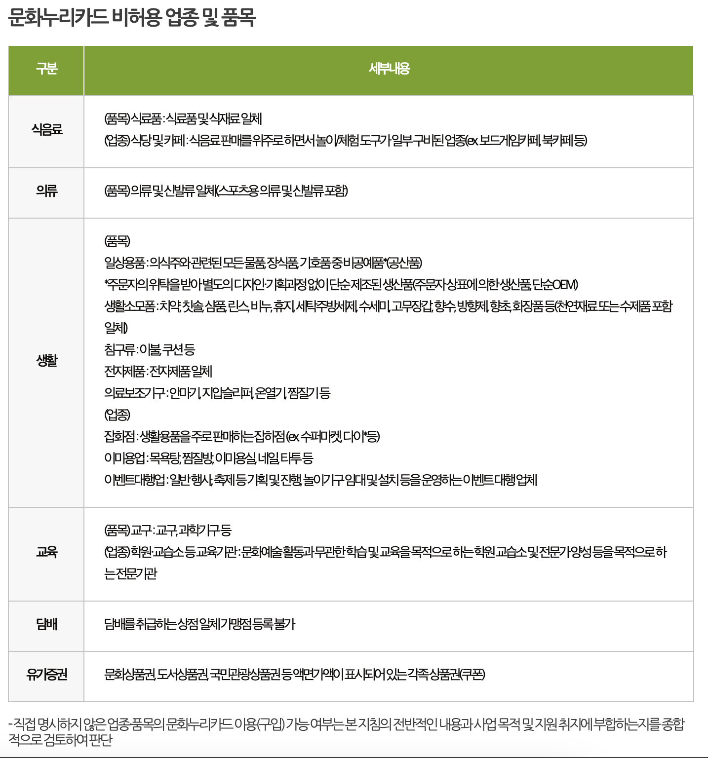 문화누리카드 허용되지 않는 업종과 품목또한 있습니다. 아래내용을 참고 하세요.